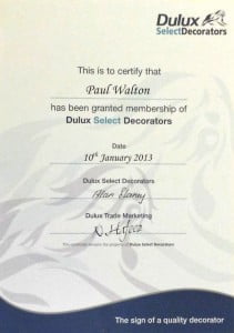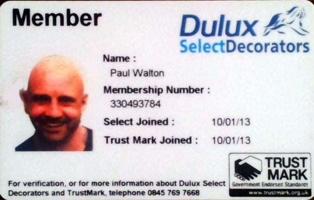 Please see below my Dulux Select Approved membership card and various papers Including the guarantee form. And a letter by Dulux letter introducing me as a member chosen by them for my high quality workmanship.